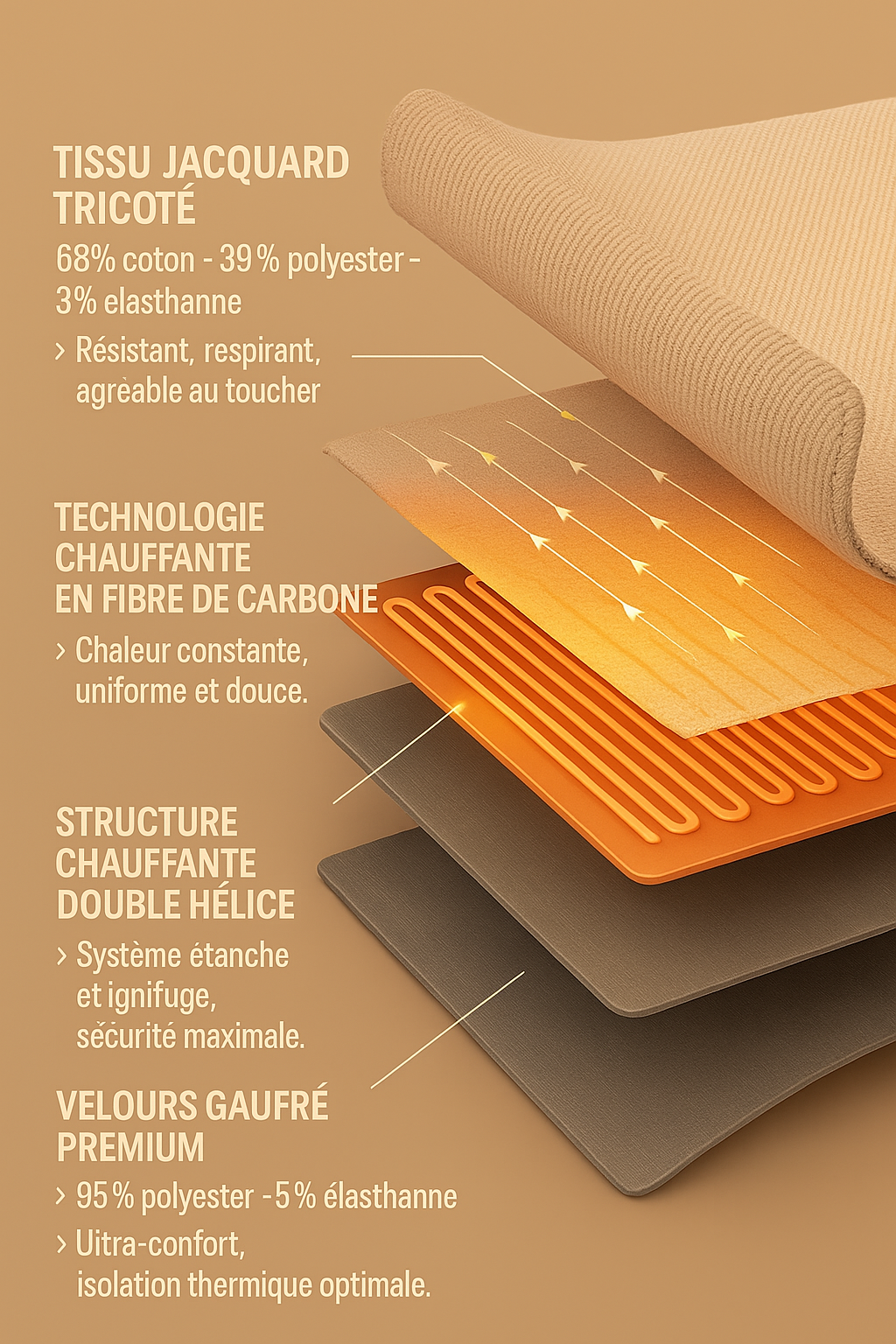 Grâce à sa technologie chauffante en fibre de carbone et sa structure sécurisée double hélice, notre plaid diffuse une chaleur douce et uniforme en quelques secondes. Conçu avec des matériaux premium, il offre un confort incomparable tout en garantissant une sécurité maximale.